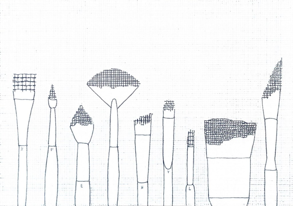 Ce dessin représente une dizaine de pinceaux aux pointes chargées de peinture. Il ajoute les grilles de I, H, F, T, E et L aux grilles de carrés, de lignes et de croix qui constituaient les trois couleurs de ma palette à l’origine du projet « Dessiner la peinture ».