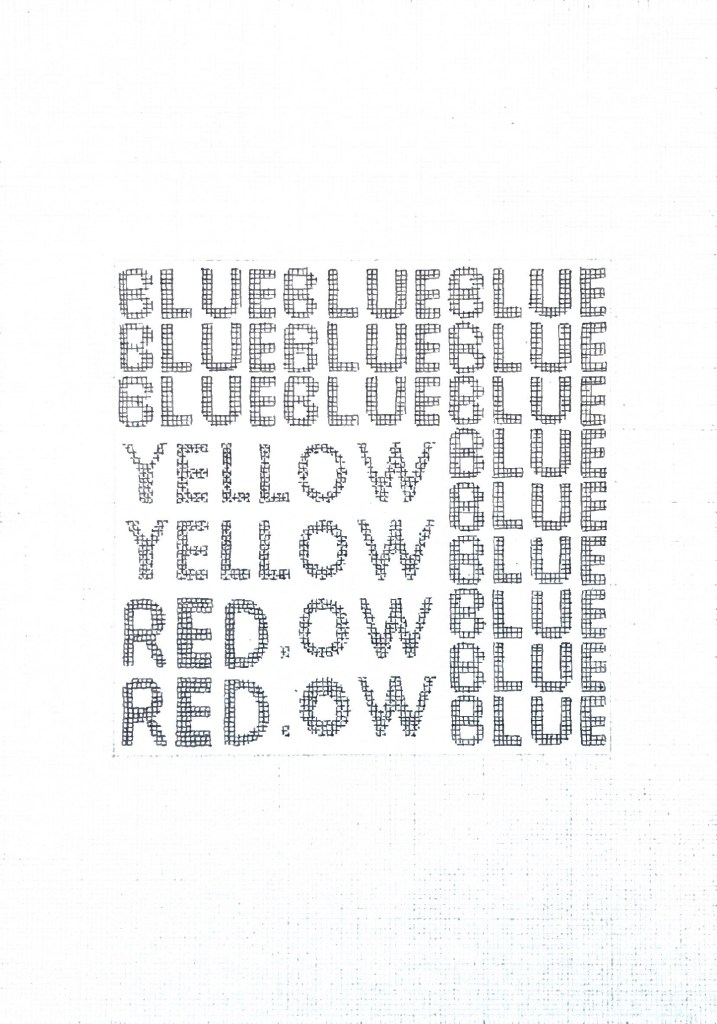 « Primaires » reprend la composition du tableau Red, Yellow, Blue d’Ellsworth Kelly. Chaque zone de couleur y est remplacée par une zone de texte : les mots « RED », « YELLOW » et « BLUE », chacun exécuté avec un seul type de grille (carré, ligne ou croix). En associant ses motifs premiers aux couleurs primaires par le biais du langage, je les place sur le même plan que les lettres : carrés, lignes, croix et alphabet relèvent désormais d’un même vocabulaire formel.
