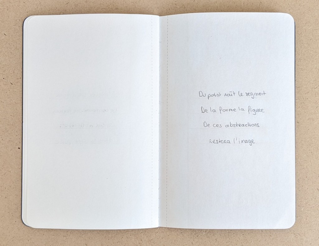 Ce carnet de poèmes, métaphore géométrique de l’existence, est une tentative de donner une dimension narrative et intime à l’abstraction. « Restera l’image » a été publié sur Art Critique dans le cadre de la carte blanche poétique de Barbara Polla.