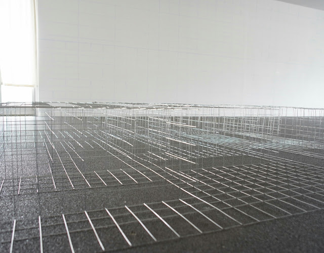 Dans cette installation reproduisant l’organisation spatiale d’un quadra (quartier à Brasilia), les grilles de dallage superposées à la grille virtuelle du plan forment un ensemble de cages.